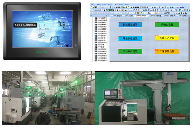 用于数控车床自动上料、装夹、卸料的控制系统,一般包含X、Y、Z、R轴等4个以上控制轴,本系统主要包含对机床信号对接、上料、装夹、加工、取料、摆料的控制逻辑功能。支持密码、U盘数据导入、用户二次编程、远程报警控制。